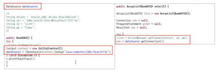 이렇게 가져온 컨텍스트는 데이터 타입을 DataSource라는 곳에다가 할당을 해서 사용하게 됩니다.