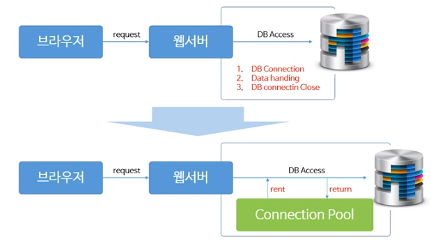 이러한 단점을 보완하기 위해 Connection객체를 미리 만들어놓고 웹서버가 데이터베이스에 접근을 할때 만들어 놓은 객체를 사용하는 것이죠.