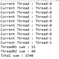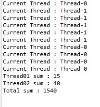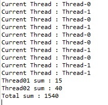 System.out.println("Total sum : " + thread01.sum + thread02.sum);
