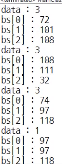 마지막에 a만 읽어온 data : 1의 부분에는 bs[0]은 97인데 bs[1]과 bs[2]는 왜 97, 119로 출력이 될까요??