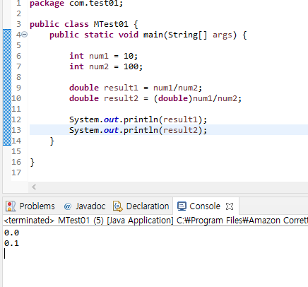 인간의 연산으로는 result1의 값도 당연히 0.1이 나와야 하지만 int형끼리의 연산은 정수만 반환하기 때문에 int형 num1과 num2를 연산하고 그 값이 double에 대입되었을 때는 double에 대입이 되어 표현은 실수형으로 보이지만 안에 들어 있는 실제 값은 0이 나오게 됩니다.