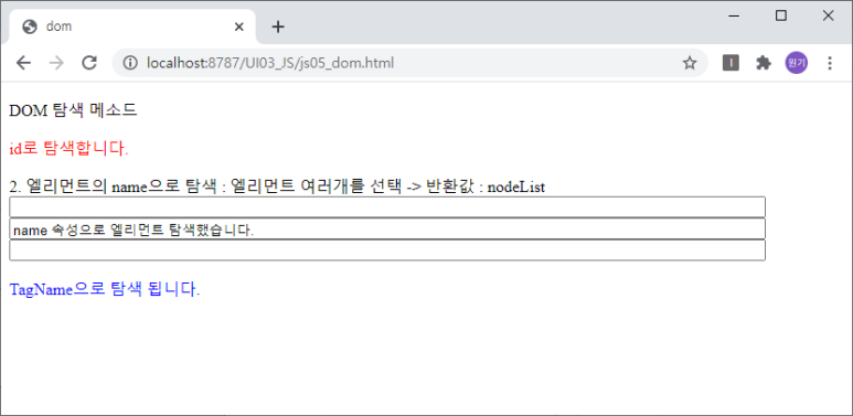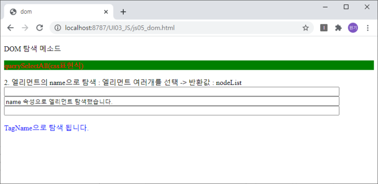 <p onclick="searchName();">2. 엘리먼트의 name으로 탐색 : 엘리먼트 여러개를 선택 -> 반환값 : nodeList<br>