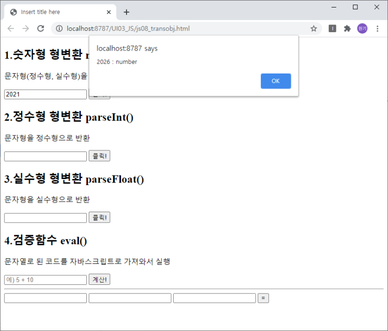 문자를 입력해서 NaN가 출력이 되었지만 타입을 알아보니 number타입입니다! 형변환 되었다는걸 알수 있습니다.