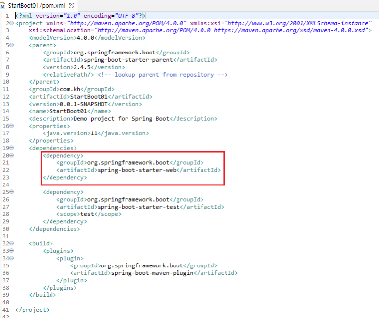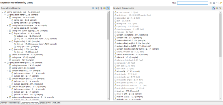 pom.xml에 보면 그냥 스프링프레임워크보다 내용이 적어보이지만 디펜던시 하나에 관련내용이 매우 많이 들어있습니다.